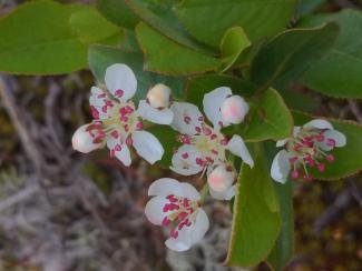 Mounding shrub up to 6 feet tall and wide (smaller cultivars are available). Beautiful white flowers in May and long-lasting black berries in the fall. Tolerates most soil conditions including compaction, some salt, some flooding, even pruning. Red-purple fall foliage. Suckering. Can form large colonies. Tough.