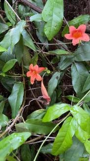 This semi-evergreen vine can cling to stone, brick, and wood without support. Found in forests and along roadsides mainly in the South,* its showy, two-tone flowers are an early nectar source for butterflies and hummers. Cross-vine refers to the cross-shaped pattern of the cut stem.
